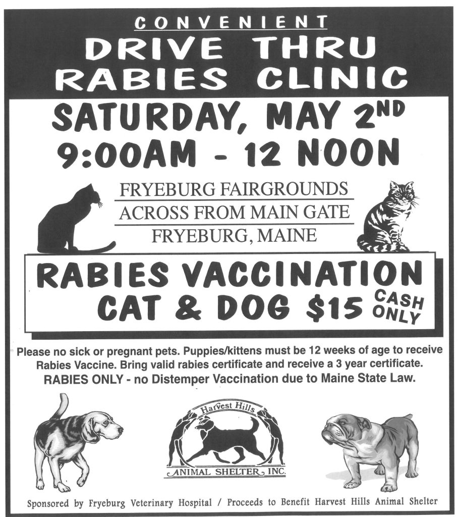 Every Spring we hold a low-cost Drive-Thru Rabies Clinic at Fryeburg Fairgrounds. Bring your dog(s) (on a leash) or cat(s) in a carrier. No sick or pregnant animals. 3 year rabies can be given with proof of previous rabies. Rabies vaccines given through Fryeburg Veterinary Hospital.